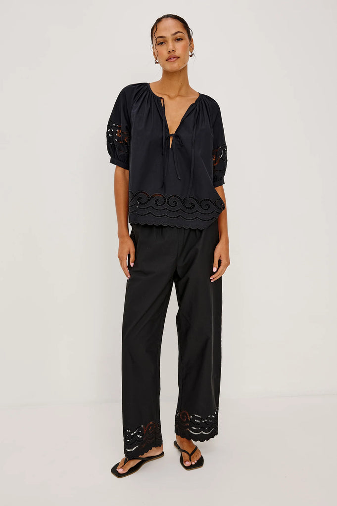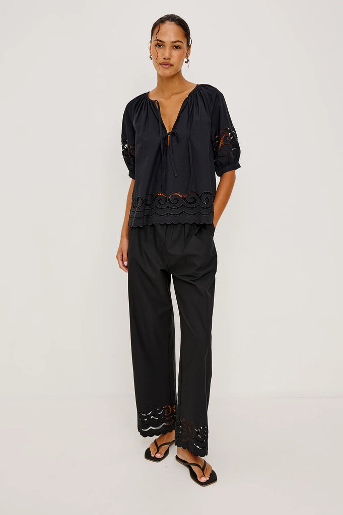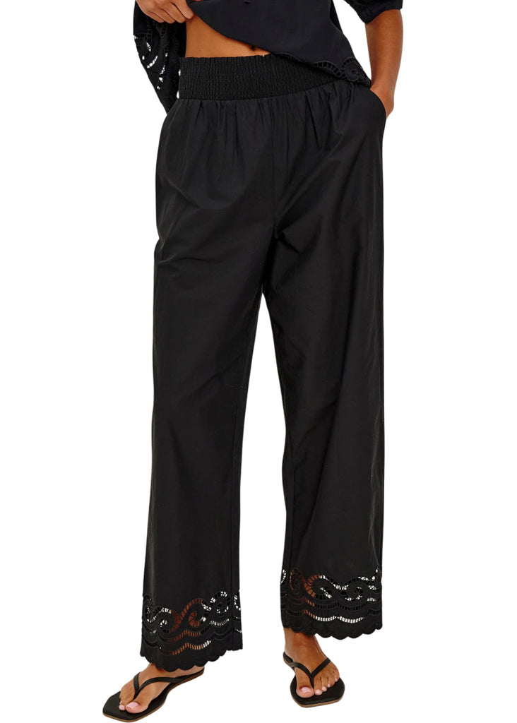 Made for easy elegance, the Rails Henrik Pant is a high-rise pant with a wide smocked waistband, straight legs, and scalloped ladder embroidery at the hem.