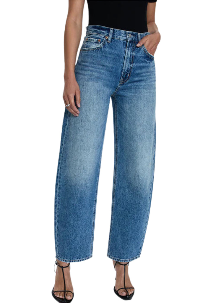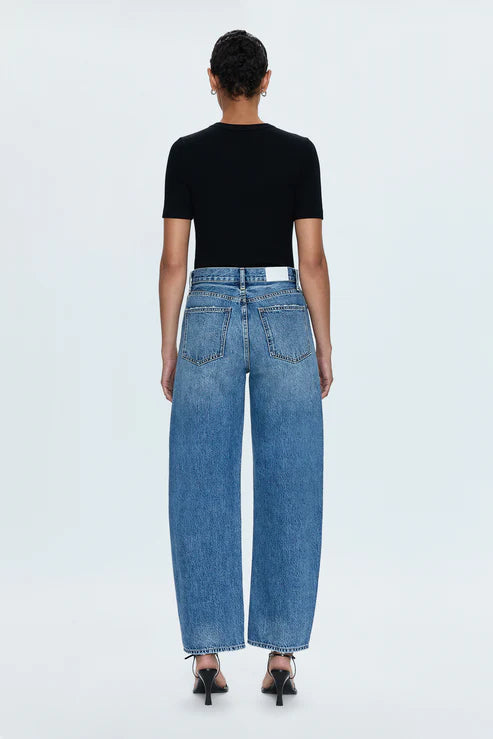 Meet the Pistola Wes Jean - Spectacle. The best-selling jean that redefines modern denim. Wes sits at a flattering high rise with a stylish barrel leg silhouette and full-length 30" inseam that creates sophisticated drama. Clean hem finishes add polished detail to the contemporary silhouette. Crafted from our premium rigid non-stretch denim in Spectacle, a vintage inspired medium blue wash with moderate fading and free of distressing for polished, lived-in perfection.