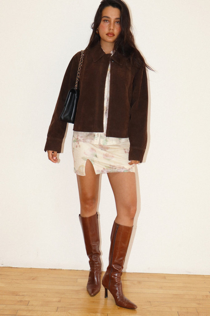 Dutton Suede Jacket VIDA MOULIN $119.00 X-Small - $119.00 Small - $119.00 Medium - $119.00 Large - $119.00 left in this size! Quantity Please enter your email below and we will notify you if it becomes available. The Dutton Suede Jacket features: Chocolate Brown Collared Long Sleeves Size up for a more oversized fit Please help our small business by reviewing our return policy and fees prior to purchasing.