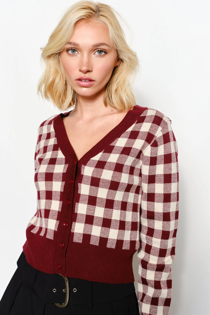 Add a cozy, playful touch to your look with the Nessa Gingham Cardigan. Featuring gingham knit fabric, a contrast edge for a pop of interest, and a front button closure, this cardigan is designed for effortless layering.