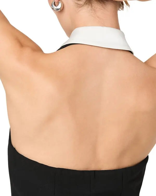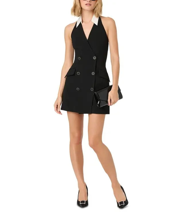 Perah Dress. This chic mini dress features a stylish halter neckline with a collar, adding a touch of elegance to your look. The double-breasted design enhances its modern appeal, making it perfect for both day and night occasions. Ideal for those who appreciate timeless fashion with a contemporary twist.