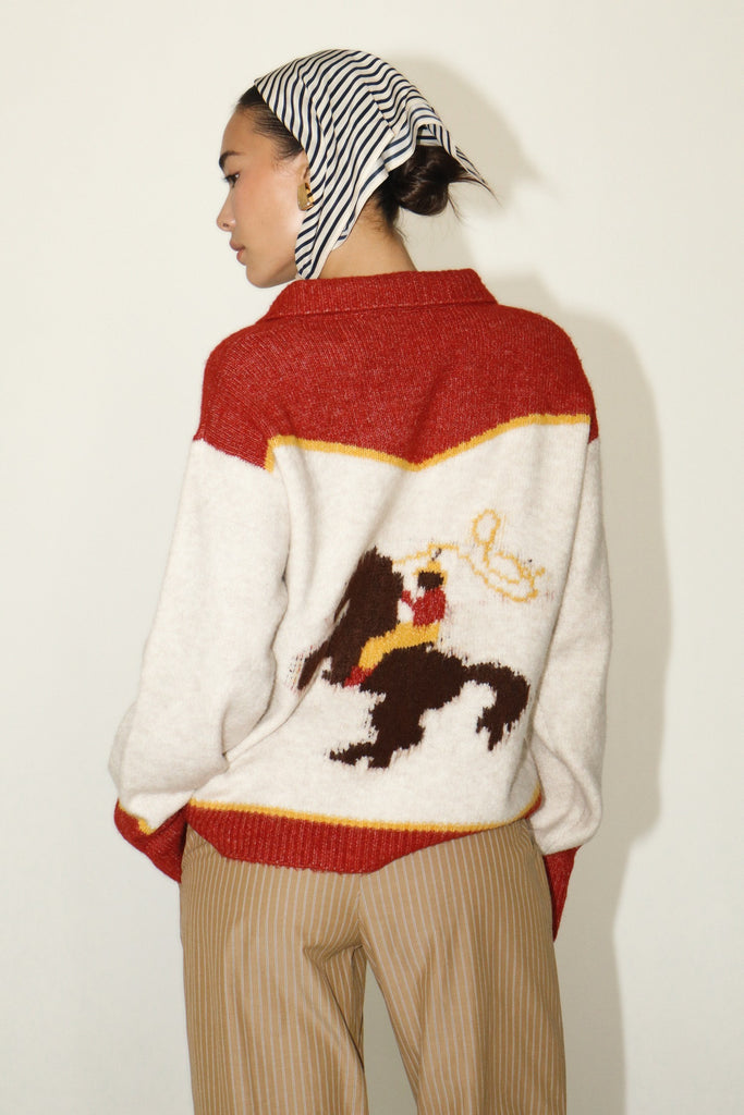 Rodeo Knit Sweater VIDA MOULIN $89.00 X-Small - $89.00 Small - $89.00 Medium - $89.00 Large - $89.00 left in this size! Quantity Please enter your email below and we will notify you if it becomes available. The Rodeo Knit Sweater features: Color: Oatmeal/Red Collared Zip up Please help our small business by reviewing our return policy and fees prior to purchasing.