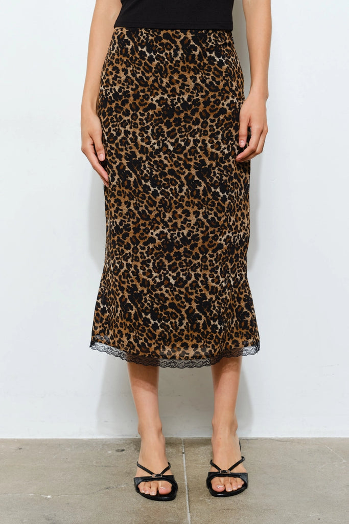 Step out and show off with the Valencia Midi Skirt-your new statement piece for instant confidence! Fierce leopard print and delicate lace trim bring the flirty drama, while the hidden side zipper keeps your look sleek. Fully lined for smooth coverage, this skirt is perfect for pairing with everything from graphic tees to silky tops. Make every moment a little more wild and a lot more fun!