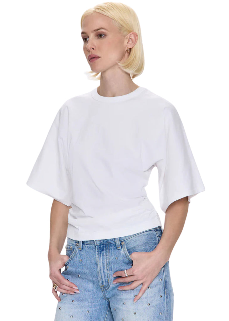 The perfect tee for the season. The Pistola Veronica Kimono Tee delivers a relaxed dolman shape with drop shoulders that transitions to a fitted silhouette through side cinching. The bodycon effect feels intentional, while the shirttail hem adds subtle movement. Crafted from a 100% cotton compact jersey that holds its shape and feels luxuriously soft against the skin. Le Blanc brings crisp white sophistication that elevates any look, great for layering or standing alone.