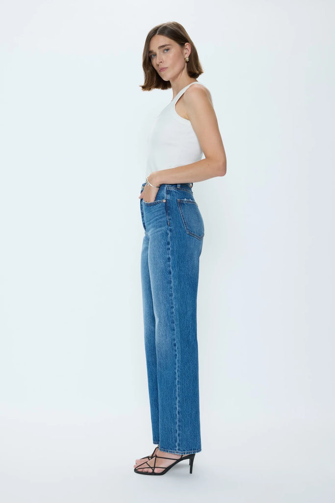 Pistola Cassie Jean - Capri Defined by its super high rise and soft structure, the Cassie Crop shapes the waist before falling into a classic straight leg. Constructed from rigid, non-stretch denim in a light, season-ready wash, the 31" inseam brings a fresh, cropped finish to the fit.