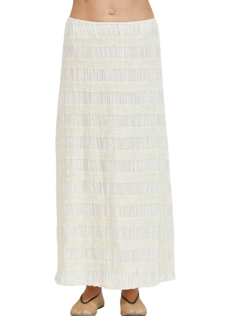 The a.ren Nixie Skirt is an easy ivory maxi skirt made for slow days and sunny moments. Featuring a comfortable elastic waistband and a subtle textured stripe detailing, it flows beautifully with every step. Lightweight and endlessly versatile, it's the perfect piece to dress up with a blouse or keep it casual with a tank and sandals.
