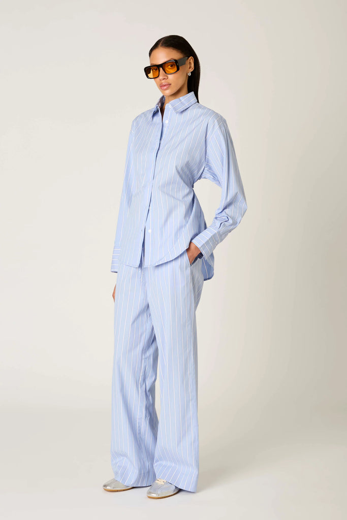 NIA Serrano Shirt. Crafted in a crisp vertical stripe, this classic button-down is reimagined with an adjustable self-tie at the back waist—giving you the option to cinch the shape or wear it loose. The pointed collar and curved shirttail hem nod to menswear structure, while the fluid silhouette keeps things light. Complete the look with the Khonny Pant for a lounge-ready outfit.
