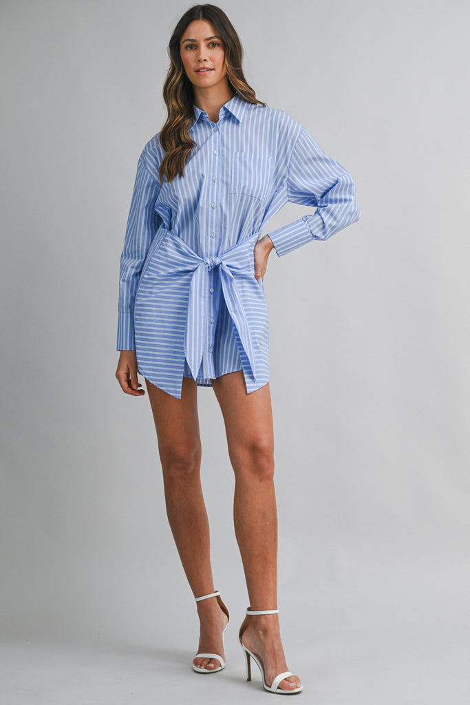 The Striped Wrap Shirt Dress is a cotton mix mini shirt dress featuring an allover vertical stripe pattern.Designed with a classic pointed collar and full button-down front closure. Wrap-style front skirt construction with self-tie closure at the waist. Long sleeves with buttoned cuffs and a chest patch pocket detail.
