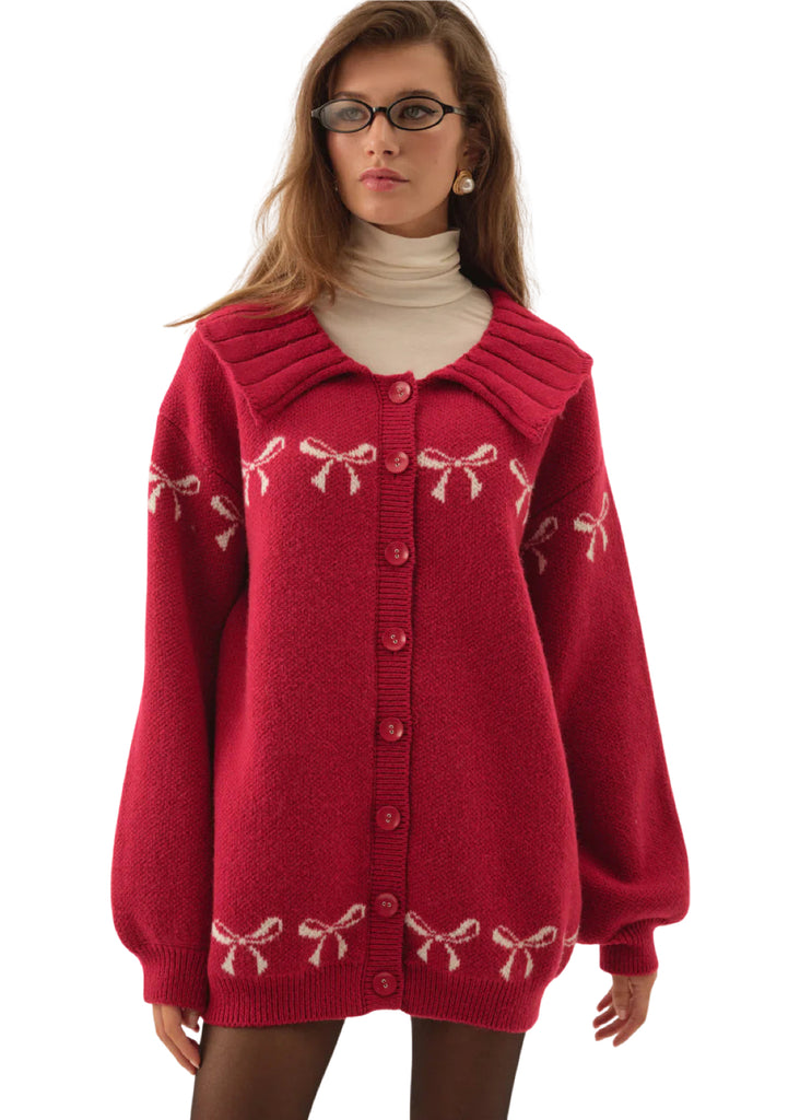For Love & Lemons Bow Intarsia Knit Sweater has a thoroughly festive feel with its bow intarsia pattern. Featuring a ribbed collar, cuffs, and billowy long sleeves, this oversized cardigan will keep you cozy during the crispest days.