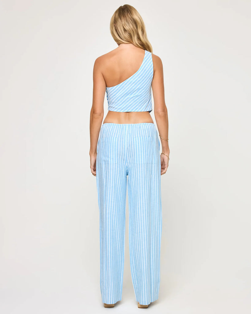 Meet the L*Space June Top - By The Bay, a chic and playful addition to your closet. This one-shoulder design brings a fresh twist with its unique handkerchief hem, adding movement and flair to any outfit. The functional buttons down the side offer a stylish touch and a customizable fit, while the cropped length and yarn-dye stripes make it perfect for pairing with high-waisted shorts, skirts or the matching Corey Pants.
