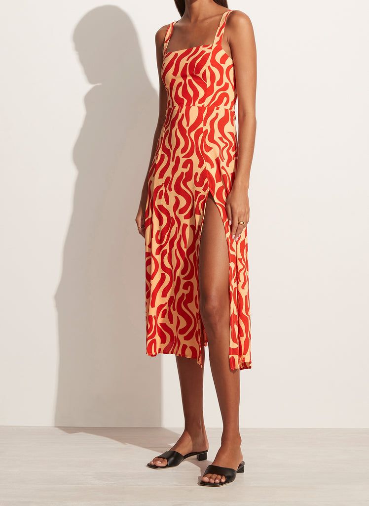 Pack the Faithfull The Brand Rubina Midi Dress for your next trip to the Italian coast! Comes in the new La Cateau Red, a gorgeous red-orange abstract print. The dress features a square neckline with thick straps, a cinched bodice, and a side slit. Pair with black slip-on sandals and a dainty snake necklace.